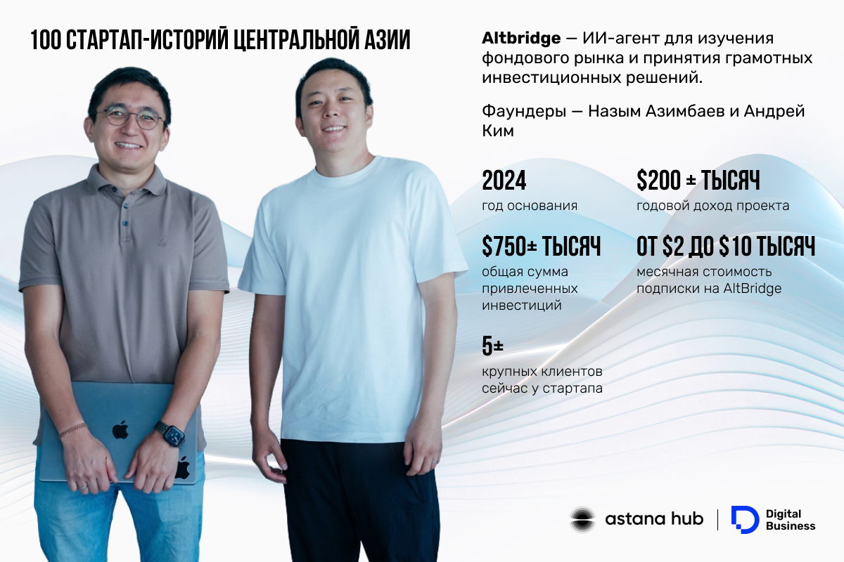 Начинаем «100 стартап-историй Центральной Азии» с рассказа о проекте Altbridge, который основали казахстанцы Назым Азимбаев и Андрей Ким. Ребята познакомились во время учебы в МГУ. Оба получали математическое образование, однако позже их пути разошлись. Андрей стал криптографом и уехал в Южную Корею, а Назым долгое время работал в Национальной инвестиционной корпорации Нацбанка РК. В прошлом году друзья объединились и основали стартап. Команда разрабатывает ИИ-агента, который собирает и анализирует финансовую информацию, чтобы инвесторы быстрее находили перспективные варианты компаний для вложений.