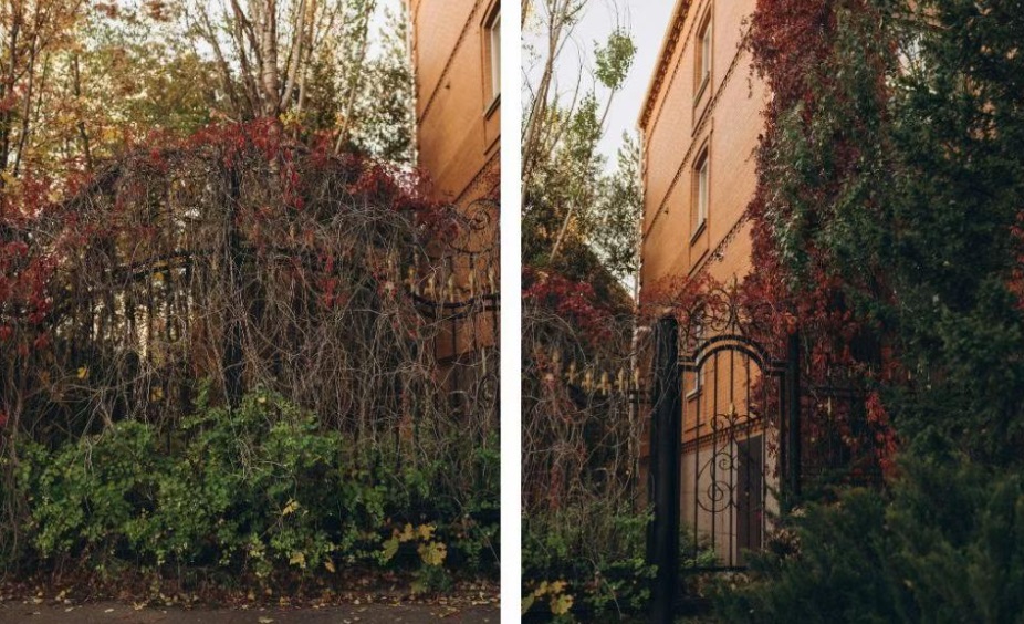 Дом с заросшим забором выглядит как декорация из сказки: ветви, листья и металлические формы переплетаются в нежном, слегка винтажном образе.