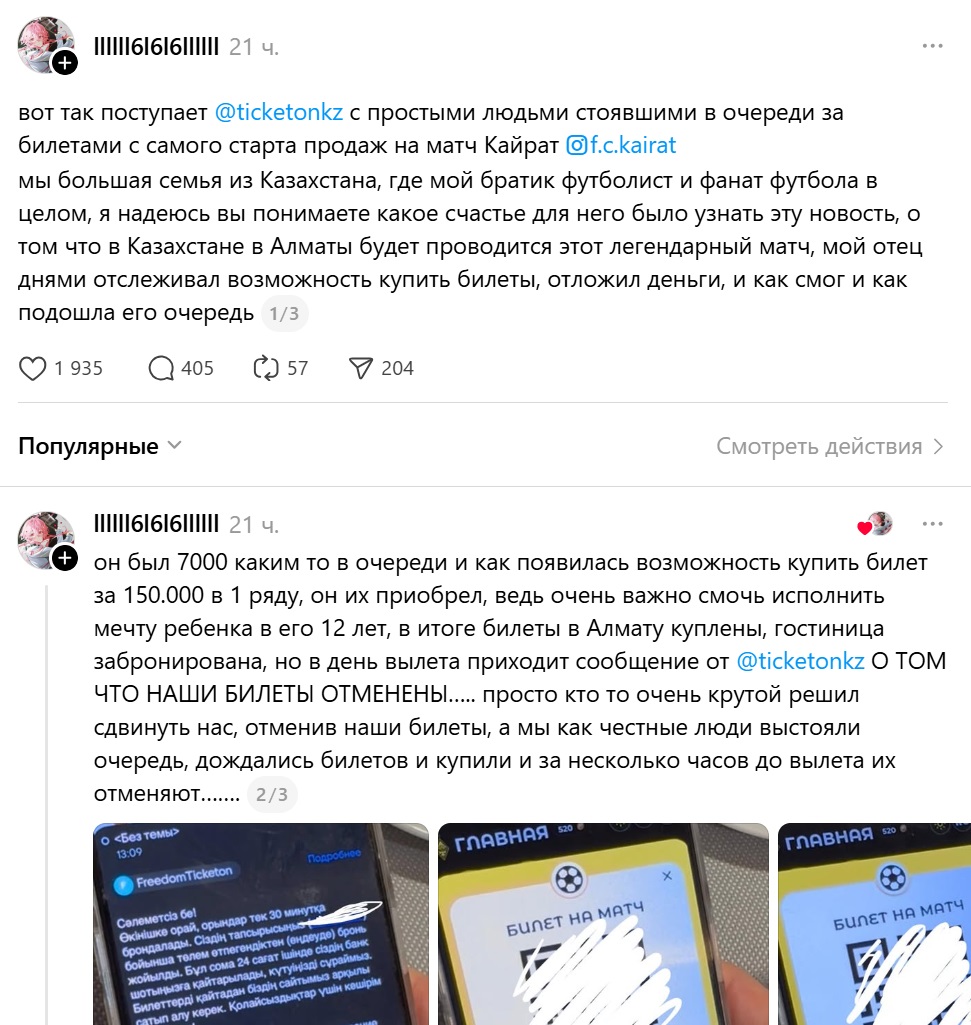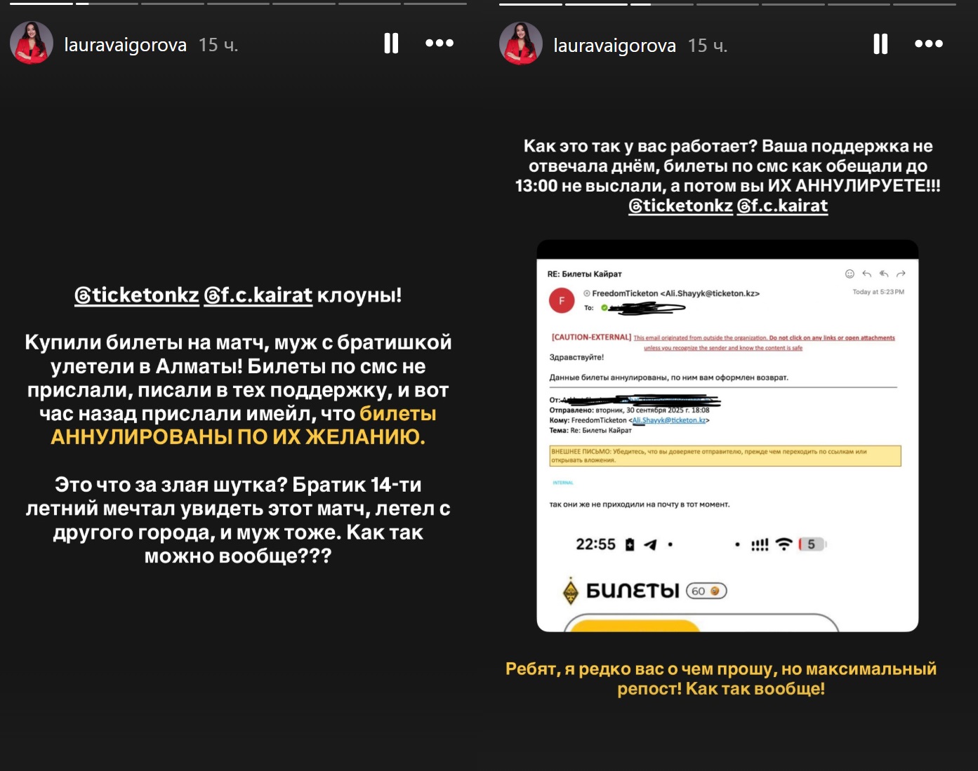 В соцсетях появилась публикация жительницы Казахстана Лауры, чья семья оказалась среди пострадавших. По ее словам, билеты на матч они приобрели заранее, супруг и 14-летний брат специально прилетели в Алматы. Однако за пять часов до игры пришло уведомление: билеты аннулированы.