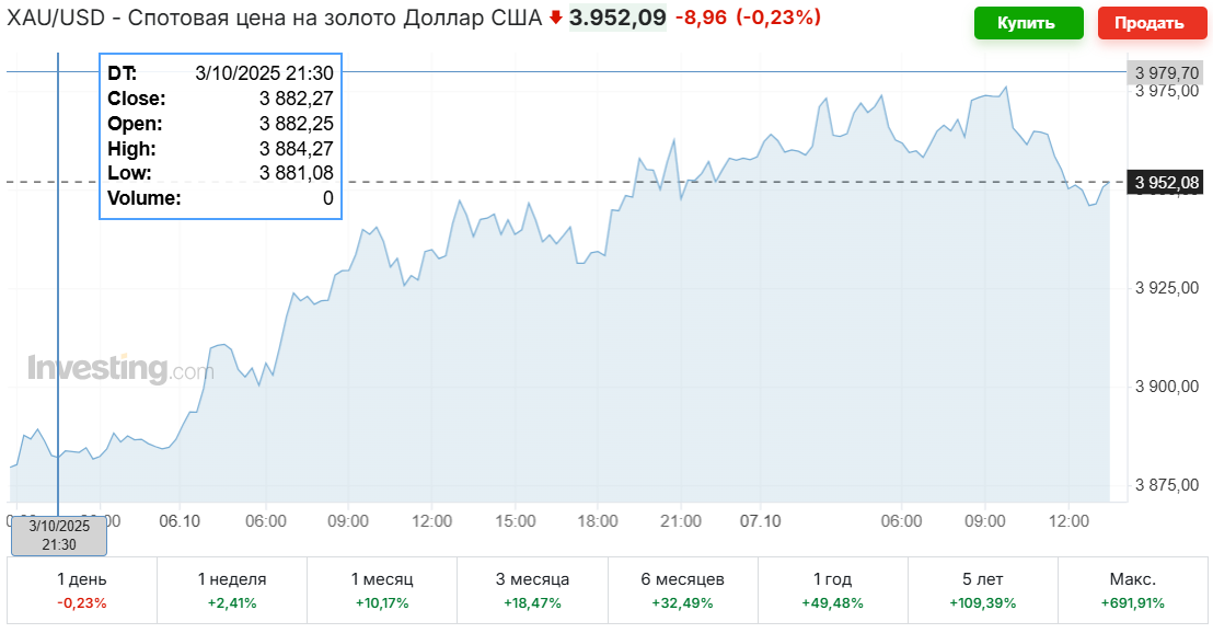 Согласно данным Investing на утро 7 октября, цена золота достигла $3985,37 за унцию - это около $128,56 за грамм. По состоянию на 13:30 произошла корректировка до $3.951,16.