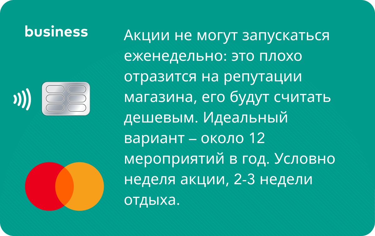 Акции не могут запускаться еженедельно: это плохо отразится на репутации магазина, его будут считать дешевым. Идеальный вариант – около 12 мероприятий в год. Условно: неделя акции, 2-3 недели отдыха.