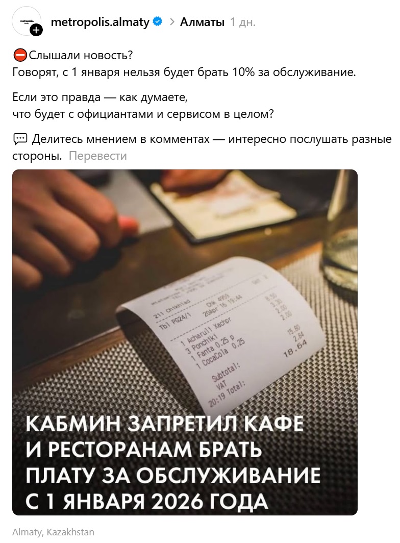 В соцсети Threads появился пост, где утверждалось, что «с 1 января нельзя будет брать 10% за обслуживание». Пользователи из Казахстана начали обсуждать, как это отразится на доходах официантов и качестве сервиса.