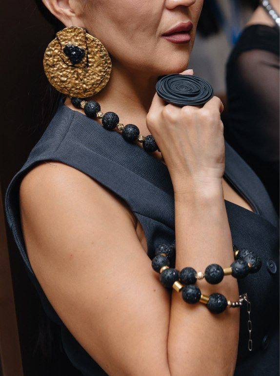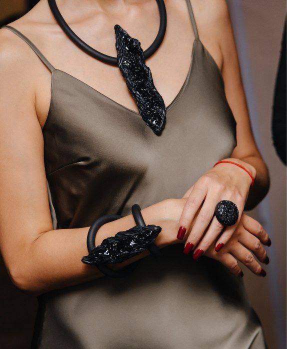 В коллекции уголь стал центральным звеном — он используется в колье, серьгах и браслетах, в сочетании с кожей, керамикой и металлом. Каждый элемент проходит обработку, шлифовку и укрепление, чтобы сохранить природную текстуру, но придать изделию прочность.