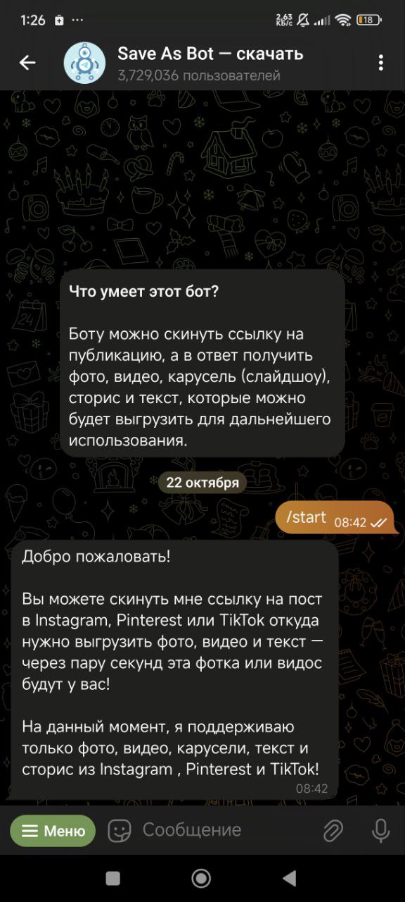 – Вас будет ждать приветственное сообщение, в котором создатель бота объяснит принцип работы;