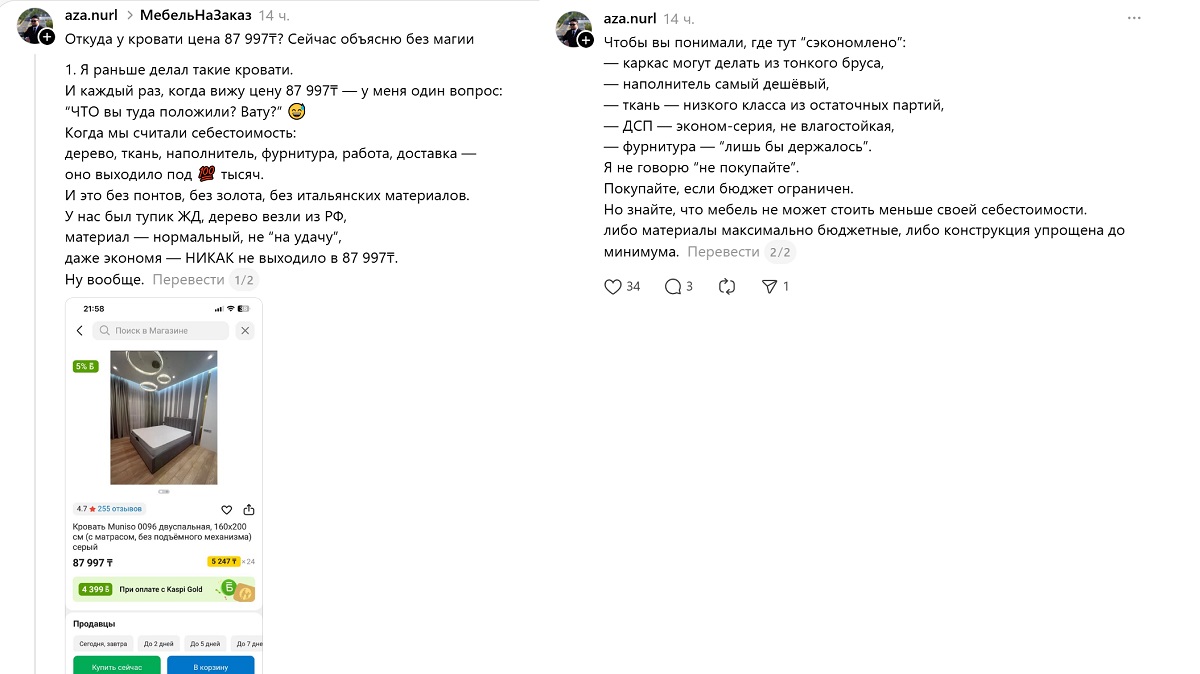 Бывший мебельщик Азамат Нурланулы откровенно рассказал в соцсети Threads, что происходит за кулисами мебельного бизнеса в Казахстане - от ценообразования и сроков до самых частых ошибок покупателей, пишет Digital Business.