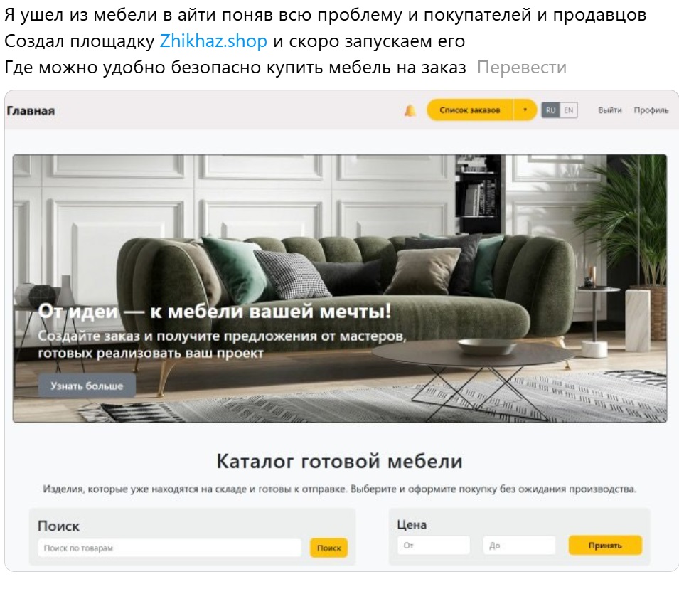 «Я ушел из мебели в ИТ, поняв всю проблему и покупателей, и продавцов. Создал площадку, где можно удобно и безопасно купить мебель на заказ», – рассказал он.
