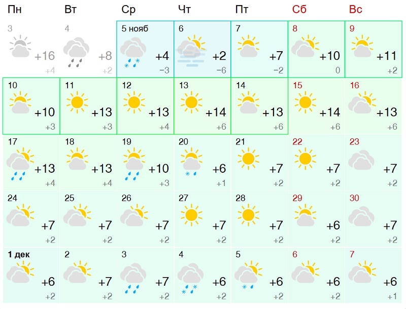 Всю следующую неделю в городе будет держаться умеренно теплая и сухая погода – от десяти до четырнадцати градусов выше нуля. Ближе к середине месяца снова возможны дожди, местами переходящие в снег.