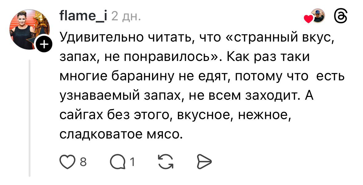 «Удивительно читать, что кому-то не понравилось. Многие не едят баранину именно из-за запаха, а у сайги этого нет. Вкусное, нежное, чуть сладковатое мясо», - пишет пользователь Threads. Кстати, некоторые почувствовали в мясе привкус полыни.