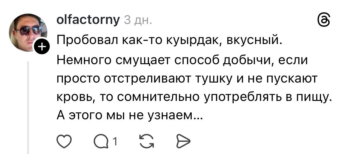 «Удивительно читать, что кому-то не понравилось. Многие не едят баранину именно из-за запаха, а у сайги этого нет. Вкусное, нежное, чуть сладковатое мясо», - пишет пользователь Threads. Кстати, некоторые почувствовали в мясе привкус полыни.