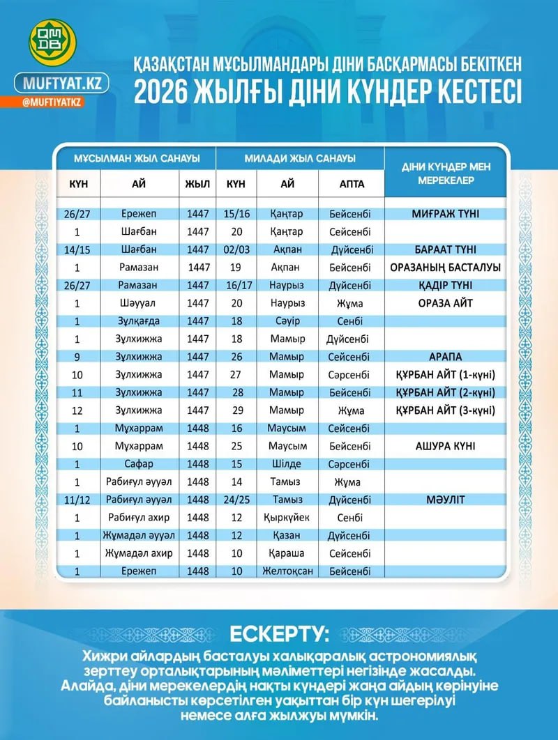 Когда пост, Қадір түні и выходные на Курбан айт: опубликован календарь на 2026 год