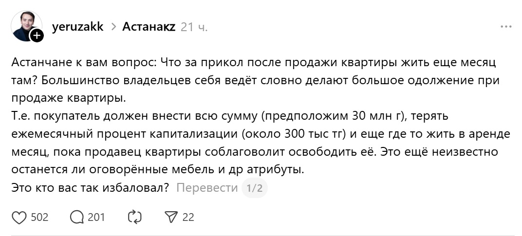 «Продал квартиру – будь добр, освободи. Окей, два-три дня на сборы, но месяц?!» – написал Ернар.