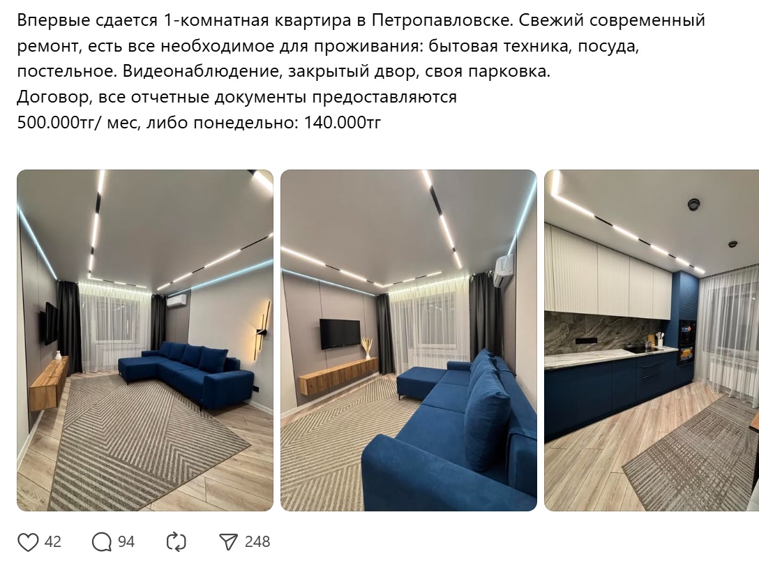 В соцсети Threads бурно обсуждают объявление об аренде однокомнатной квартиры в Петропавловске за 500 тысяч тенге в месяц. Судя по публикации, это новое жилье с современным ремонтом и полным набором удобств, пишет Digital Business.