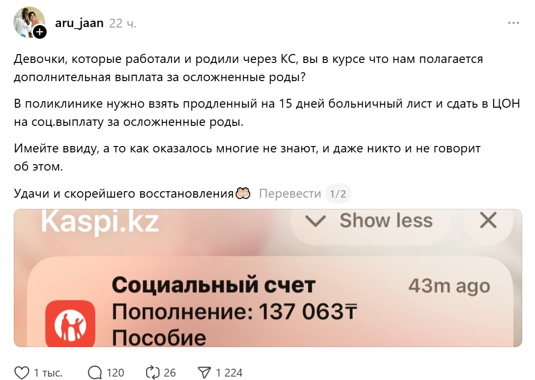 «Девочки, кто родил через кесарево – вам полагается допвыплата. Нужно взять в поликлинике продленный на 14 дней больничный и сдать его в ЦОН. Многие об этом не знают», – написала жительница Казахстана по имени Аружан в Threads.