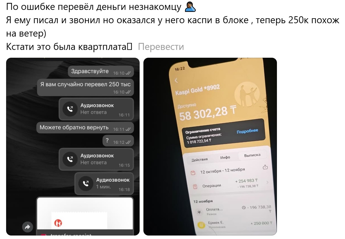 В соцсети Threads мужчина рассказал, что по ошибке перевел 250 тысяч тенге незнакомому человеку.