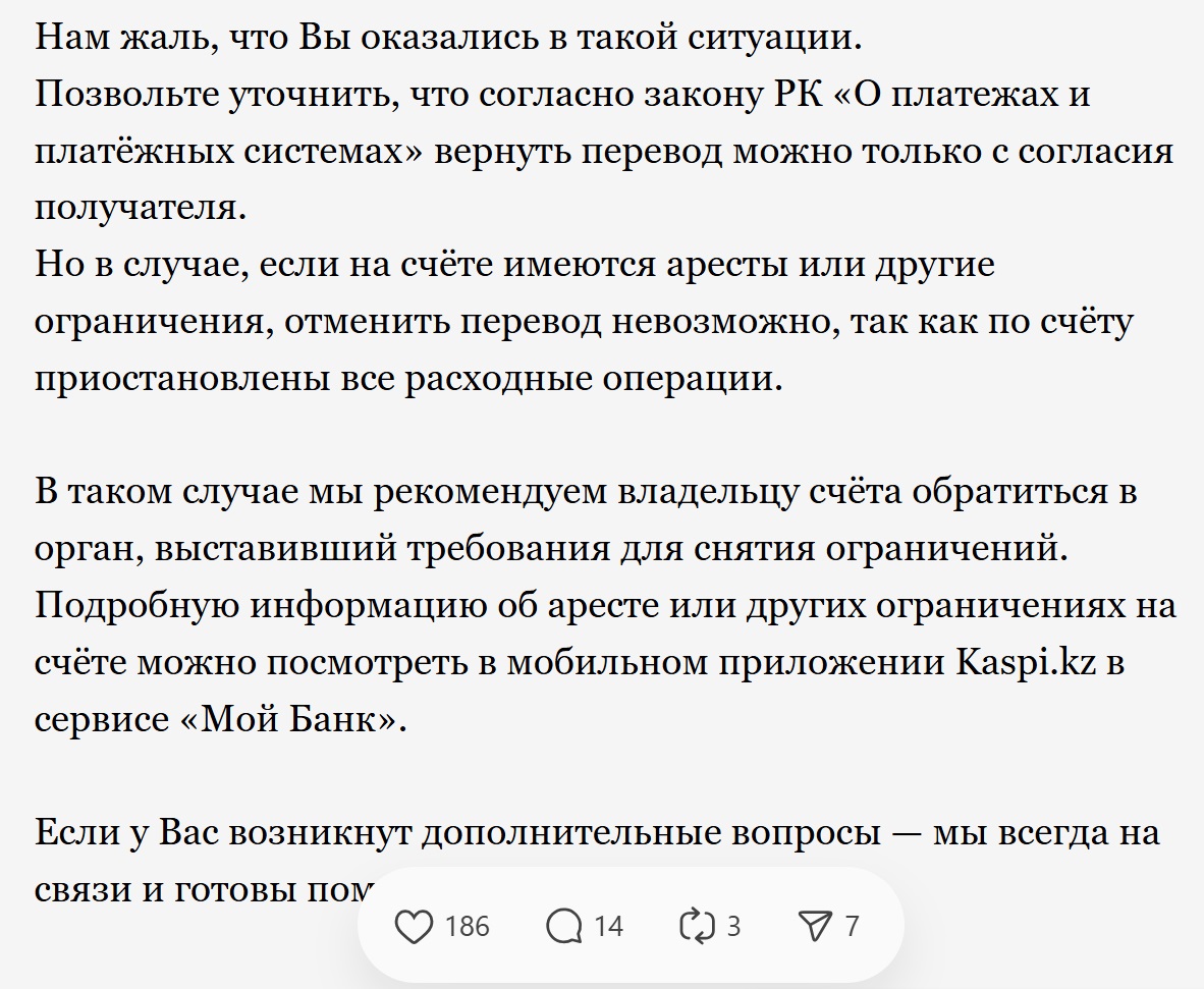 Kaspi рекомендует владельцу счета – то есть получателю – обратиться в орган, который выставил требования, чтобы снять ограничения.