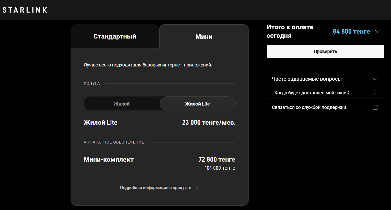 Starlink официально снизил цену мини-комплекта для Казахстана с 104 000 до 72 800 тенге. С подключением тарифа «Residential Lite» начать пользоваться спутниковым интернетом теперь можно всего за 84 800 тенге, пишет digitalbusiness.kz