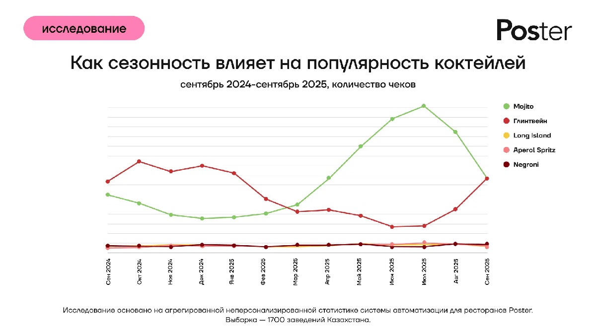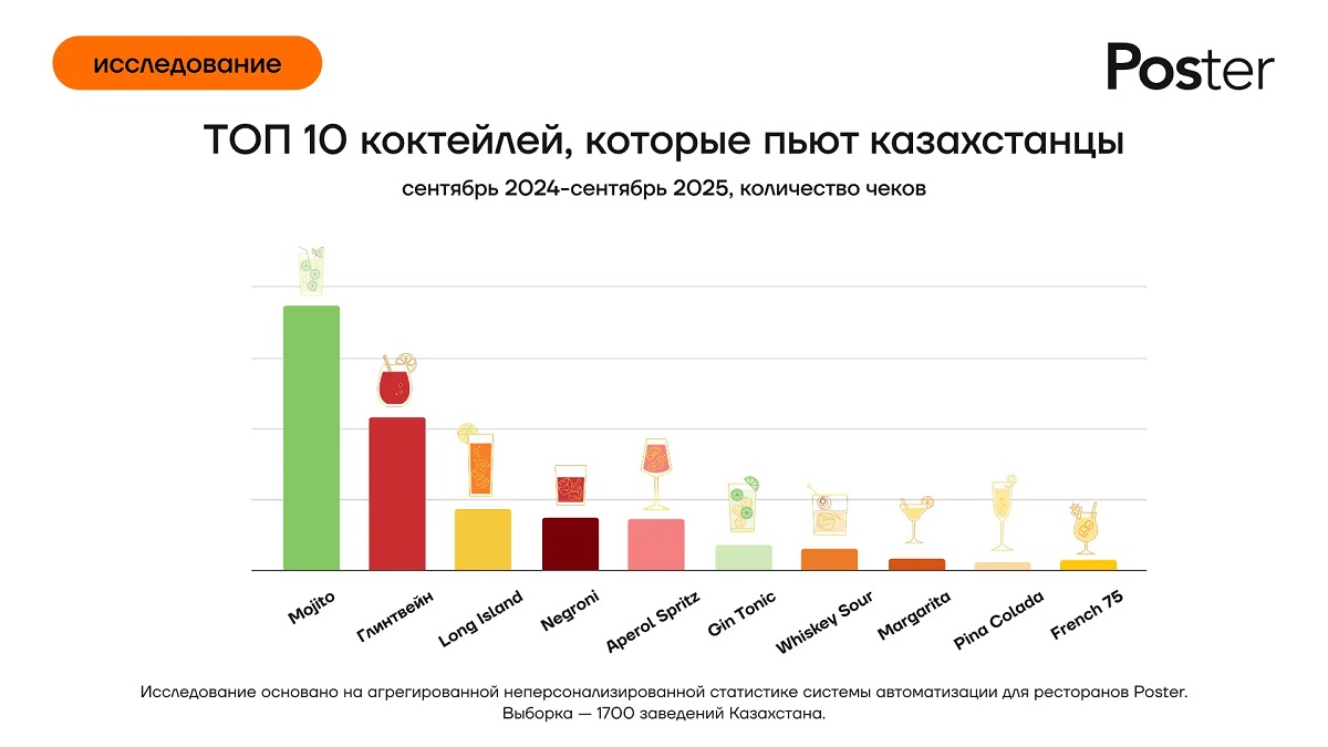 Компания Poster проанализировала миллионные продажи в 1700 заведениях страны и составила свежий рейтинг коктейльных предпочтений казахстанцев, пишет Digital Business.