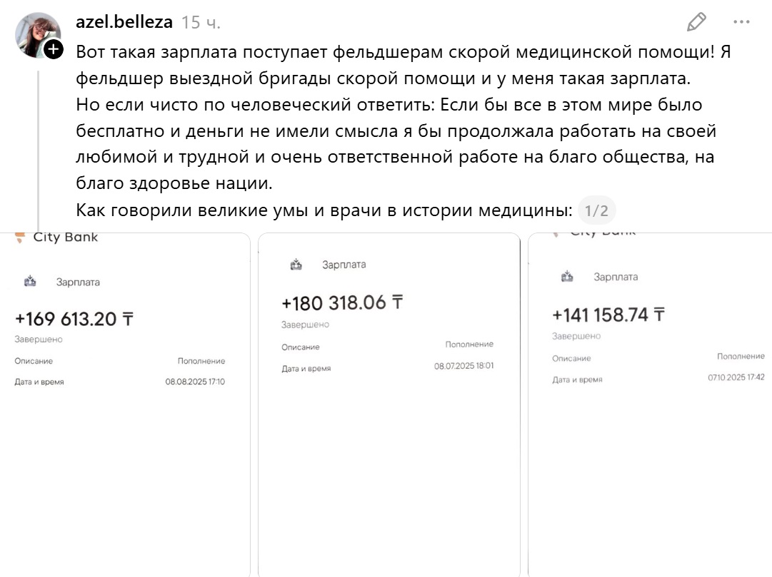 Фельдшер скорой помощи из Темиртау по имени Азель опубликовала в threads свою зарплату, которая шокировала комментаторов. На фоне эмоциональной дискуссии Digital Business решил проверить: сколько получают фельдшеры в Казахстане и какие доходы им предлагают за границей.
