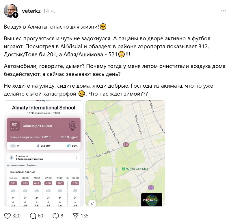 «Вышел прогуляться и чуть не задохнулся… AirVisual показывает 312 у аэропорта, 201 на Достык–Толе би, а на Абая–Ашимова – 521! Не ходите на улицу, сидите дома».