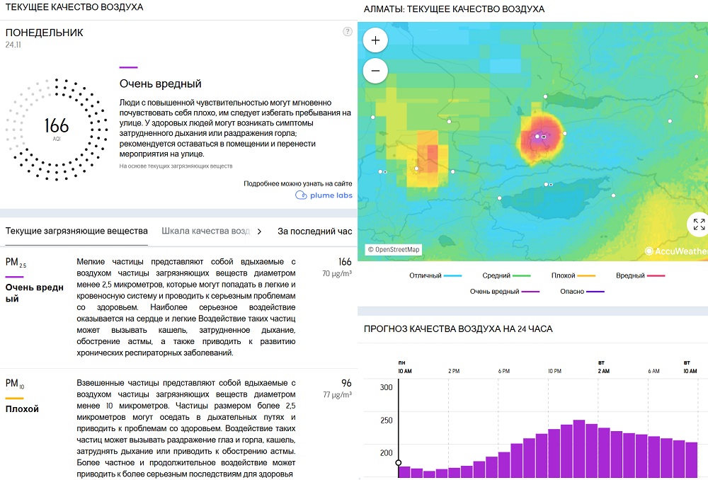 По данным accuweather.com, на момент публикации: AQI – 166 (вредный уровень). Людям с повышенной чувствительностью рекомендуют избегать улицы. Здоровым – оставаться дома.