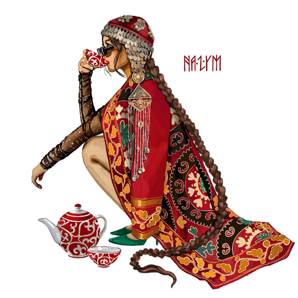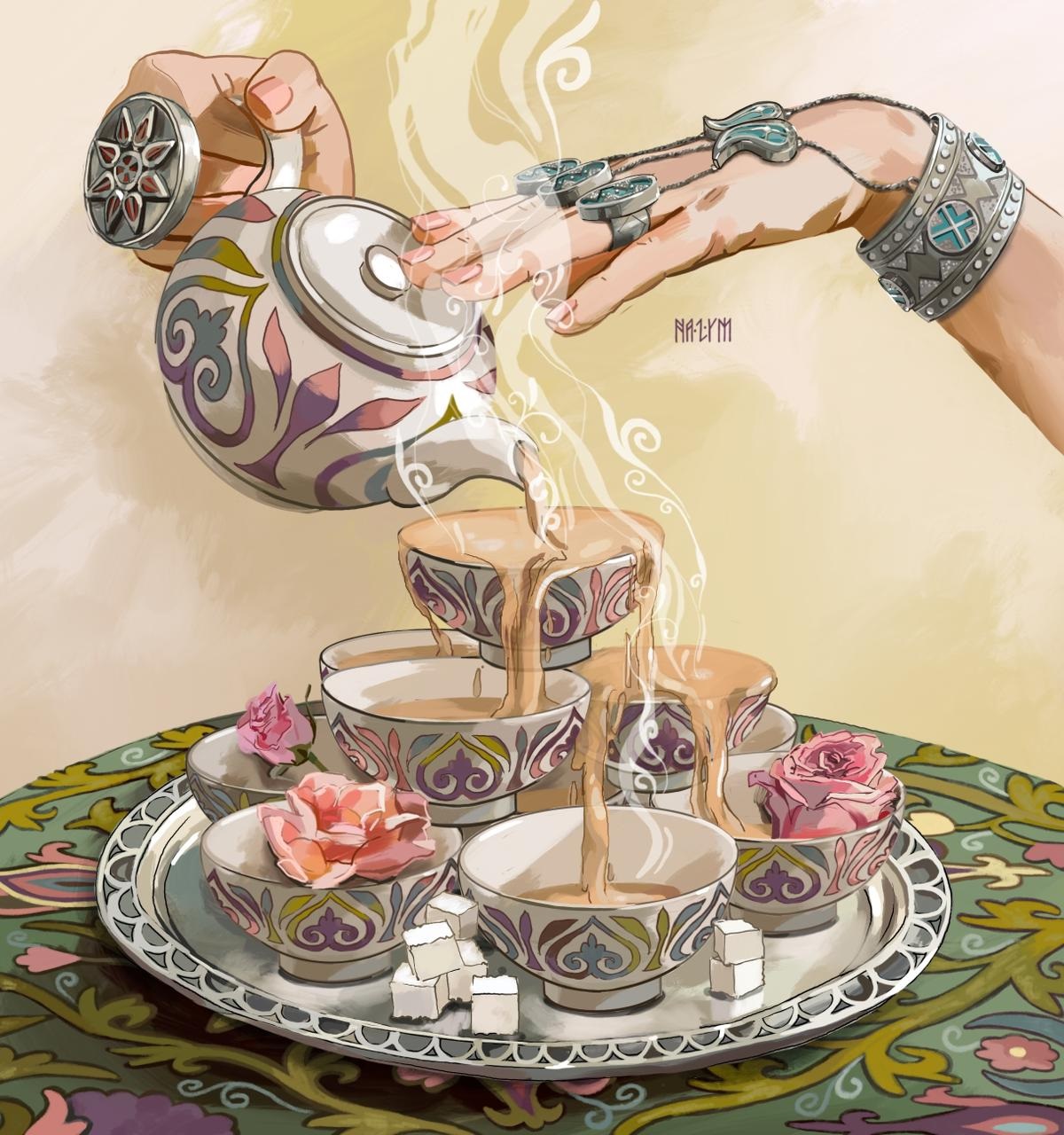 «Там изображена пирамидка из кесешек, а сверху льется чай с молоком – мой любимый напиток. Чайник держит женская рука с казахскими украшениями. Работа яркая, теплая, необычная, и видимо, именно это так привлекает», – делится художница.