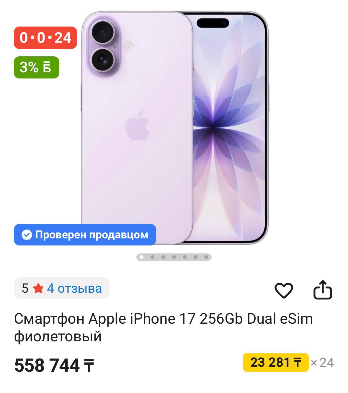 Это уже настоящая классика жанра: всегда интересно отслеживать, как меняется цена базовой модели последнего iPhone. На момент публикации самое доступное предложение мы нашли за 558 774 тенге - модель с 256 ГБ памяти, поддержкой Dual eSIM и в фиолетовом цвете.