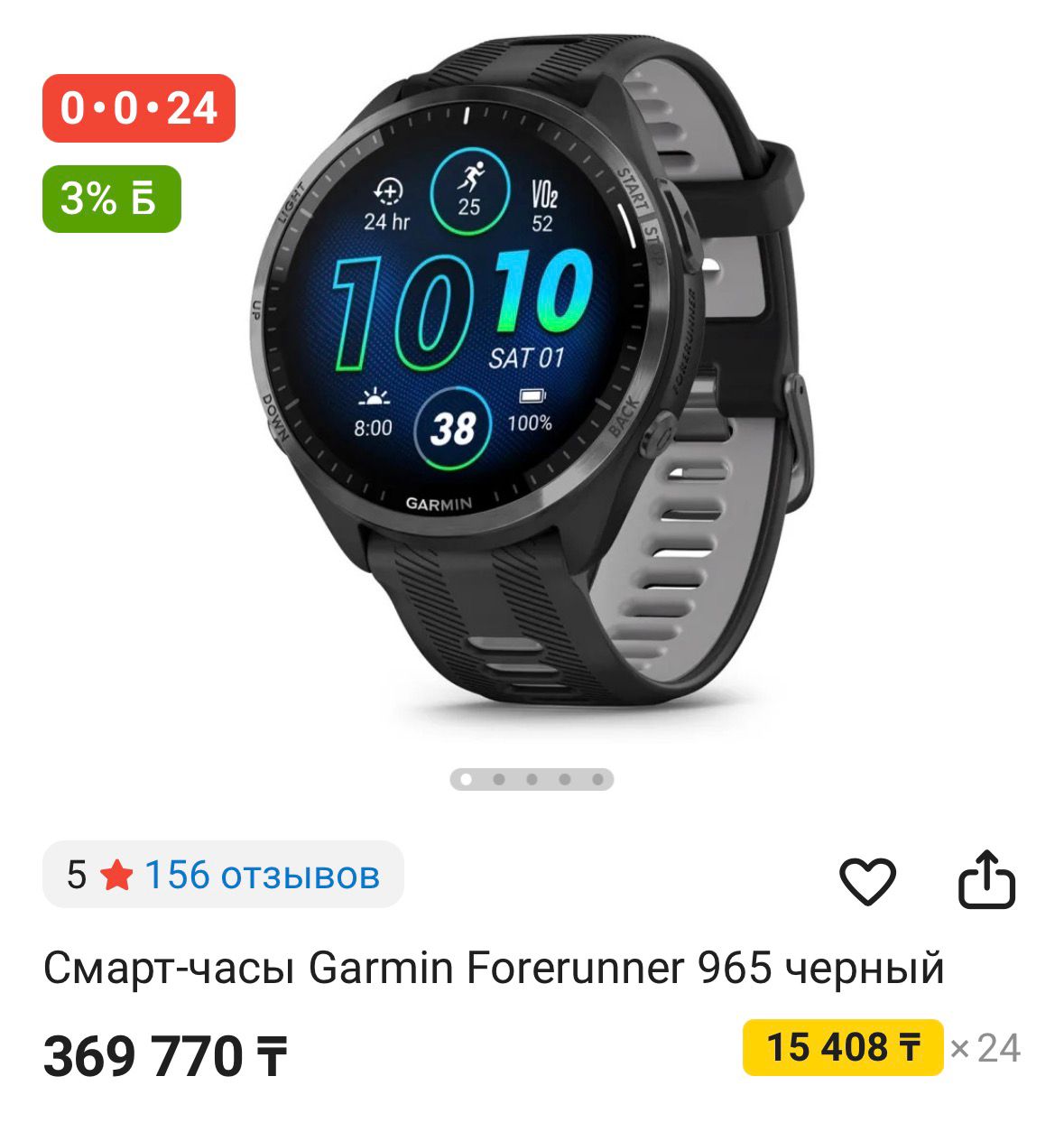 Одна из самых популярных линеек смарт-часов Garmin сейчас предлагается по цене 369 770 тенге. Возможно, модель не самая технологичная в портфолио производителя, но судя по количеству отзывов, она пользуется наибольшим спросом. Мы зафиксировали цену на Forerunner 965 в сером корпусе диаметром 47 мм с экраном 1,4 дюйма.