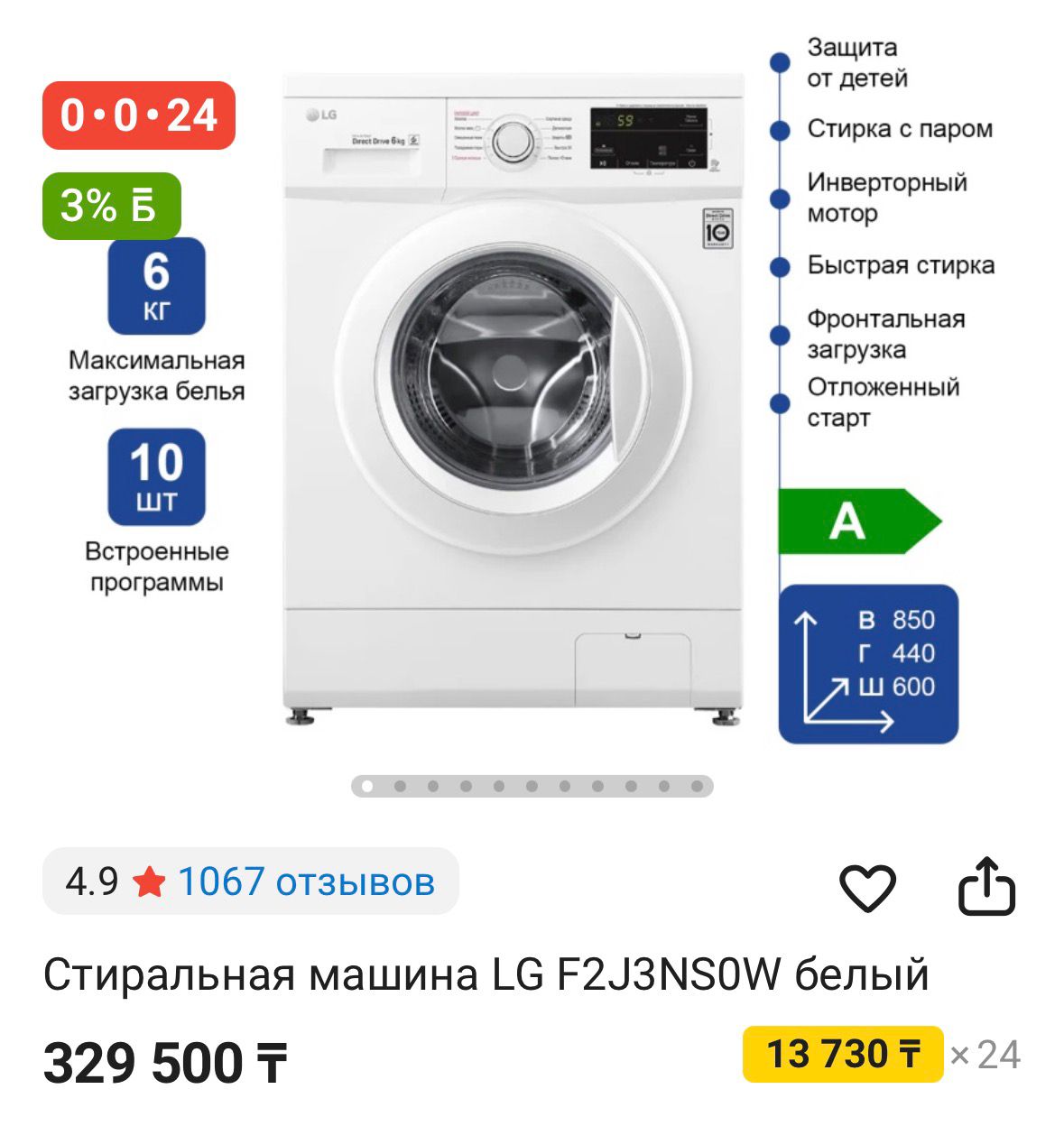 Эта модель заслуженно привлекает внимание покупателей и стала третьей в нашей подборке для фиксации цен. На момент публикации она предлагается за 329 500 тенге. Интересно будет проследить, изменится ли цена в январе 2026 года. Для справки: cстиральная машина рассчитана на 6 кг белья, имеет стандартные габариты 85 / 60 / 44 см и оснащена инверторным двигателем, что обеспечивает тихую работу.