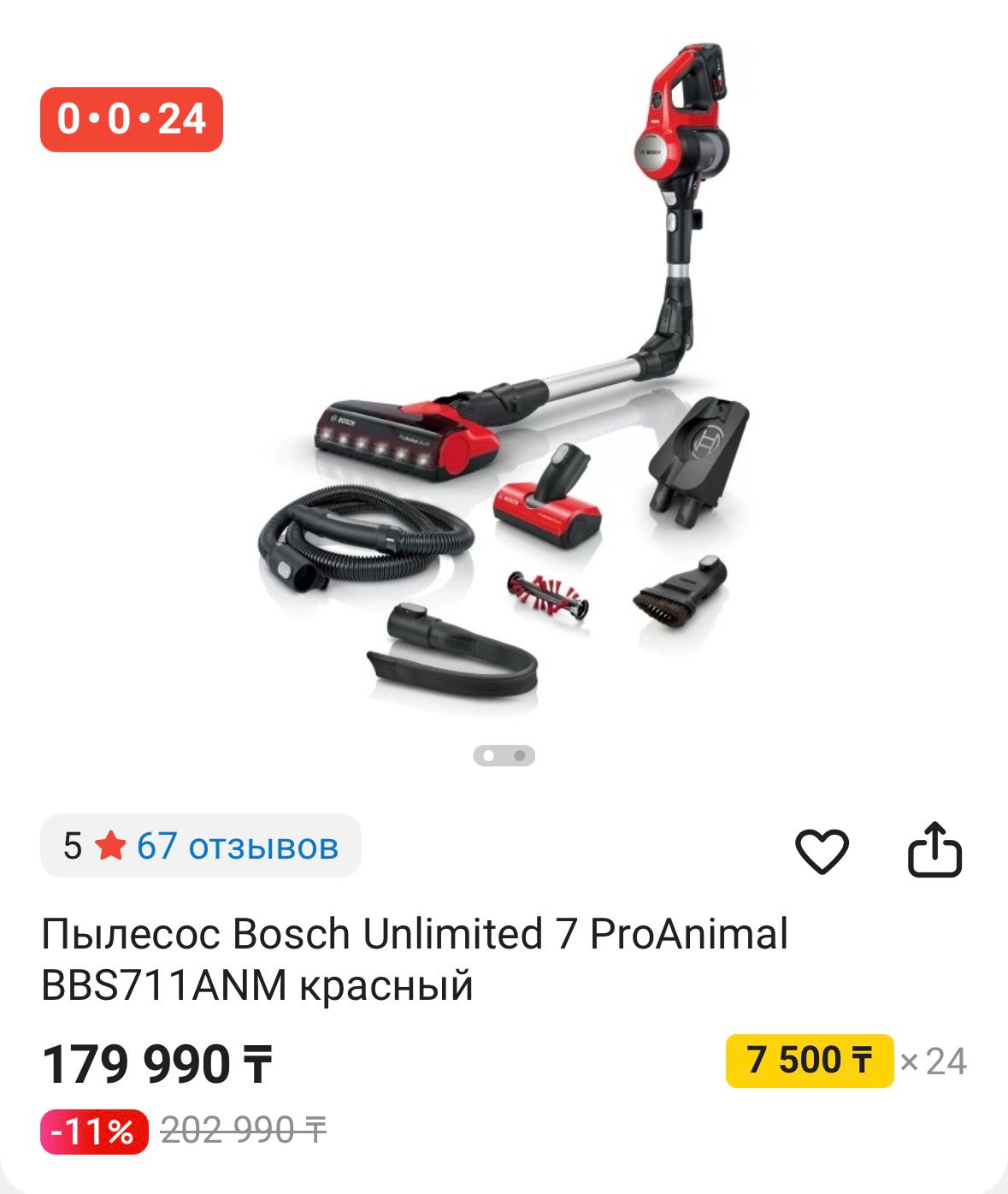 Решили, что это будет что-нибудь от Bosch - для разнообразия. Есть у них очень приятная линейка пылесосов со съемными аккумуляторами (как на шуруповертах) - Bosch Unlimited 7 ProAnimal BBS711 ANM. Стоит такое устройство сейчас 179 990 тенге в красном цвете (да, не всем подойдет). Продавец утверждает, что действует скидка 11%, но так ли это на самом деле - не проверить. Посмотрим, как изменится цена в январе 2026 года.