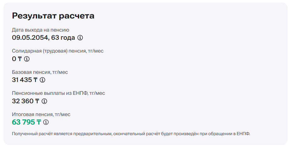 Онлайн-калькулятор выдал итоговую сумму будущей пенсии - 63 795 тенге в месяц (это в 2054 году) - и сразу же попытался нас успокоить прямо под расчетом: «Полученный расчет является предварительным, окончательный будет произведен при обращении в ЕНПФ».