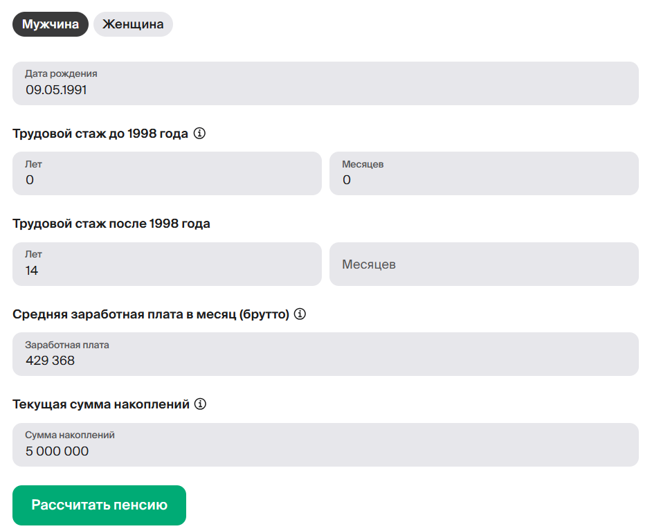 В графе «Средняя заработная плата» мы поставили 429 368 тенге - такой показатель минтруда официально считает средней заработной платой по стране за последние пару месяцев 2025 года. Далее мы представили, что наш условный герой - 34-летний мужчина, у которого уже есть 5 млн тенге накоплений в ЕНПФ с учетом инвестиционного дохода. Стаж до 1998 года у него отсутствует, зато он с 18 лет официально работает и исправно делает отчисления - всего 14 лет стажа.