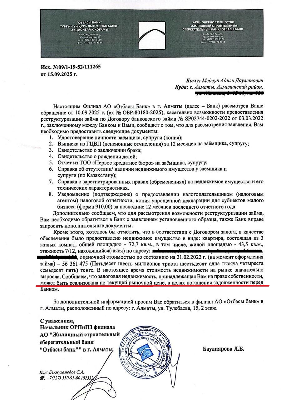 Позиция «Отбасы банка» по аналогичной ситуации с другим ЖК
