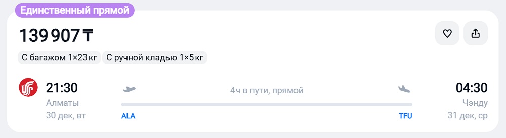 Air China запускает рейсы дважды в неделю – по вторникам и субботам. Стоимость билета туда-обратно начинается от 440$ (225 тысяч тенге) на человека. Время в пути – около 5–6 часов.