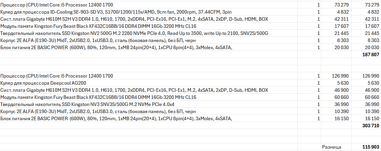 «Далеко ходить не нужно, у меня под рукой расчет простенького компьютера, который мы делали под клиента на массовый закуп. Сделал для вас таблицу для сравнения за 2 месяца 1 к 1. Прирост в стоимости даже этом сегменте уже 61%», - говорит собеседник.