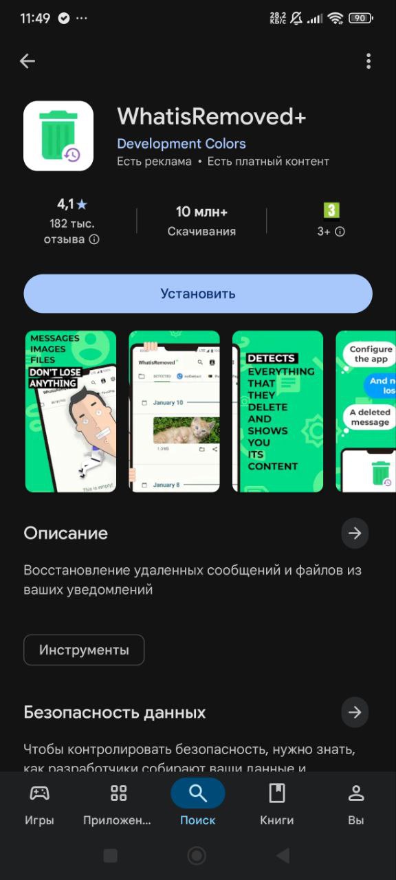 Итак, на «сером» рынке чтения удаленных сообщений есть несколько приложений. Пожалуй, самое популярное – WhatisRemoved+.