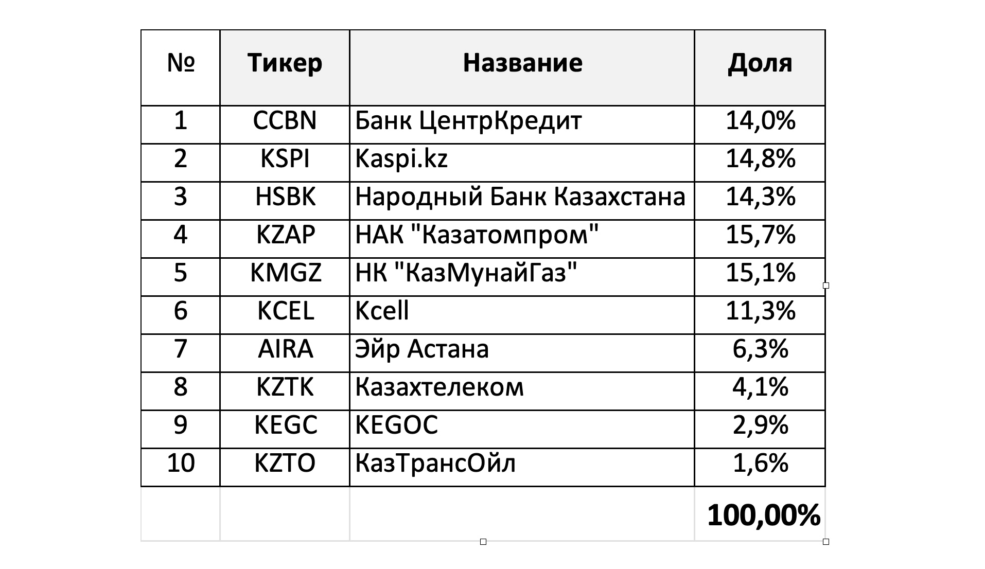 Например, на 8 декабря состав индекса KASE выглядел так:
