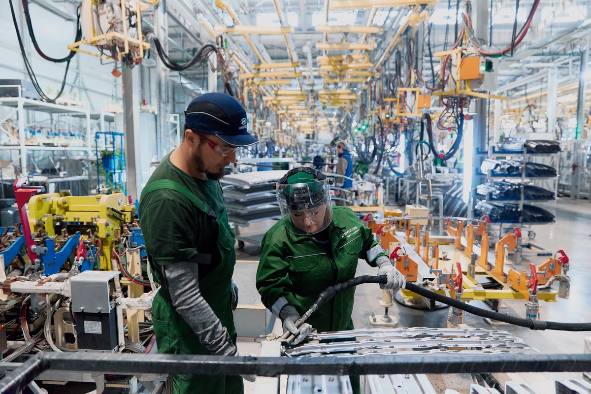 В цехе сварки пахнет горячим металлом. Двое рабочих в зеленых спецовках с логотипом Hyundai склонились над деталями кузова. Один в защитной маске ведет сварочный пистолет, второй контролирует процесс.