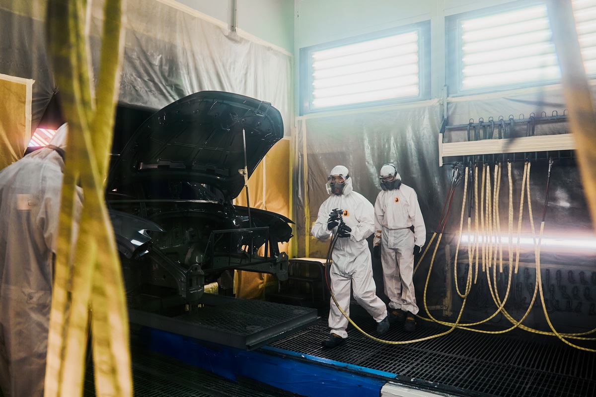 В цехе окраски действует особый режим. Перед входом журналистов заводят в специальный бокс: мощные вентиляторы обдувают одежду со всех сторон. Любая пылинка на свежеокрашенном кузове означает брак и повторную покраску.