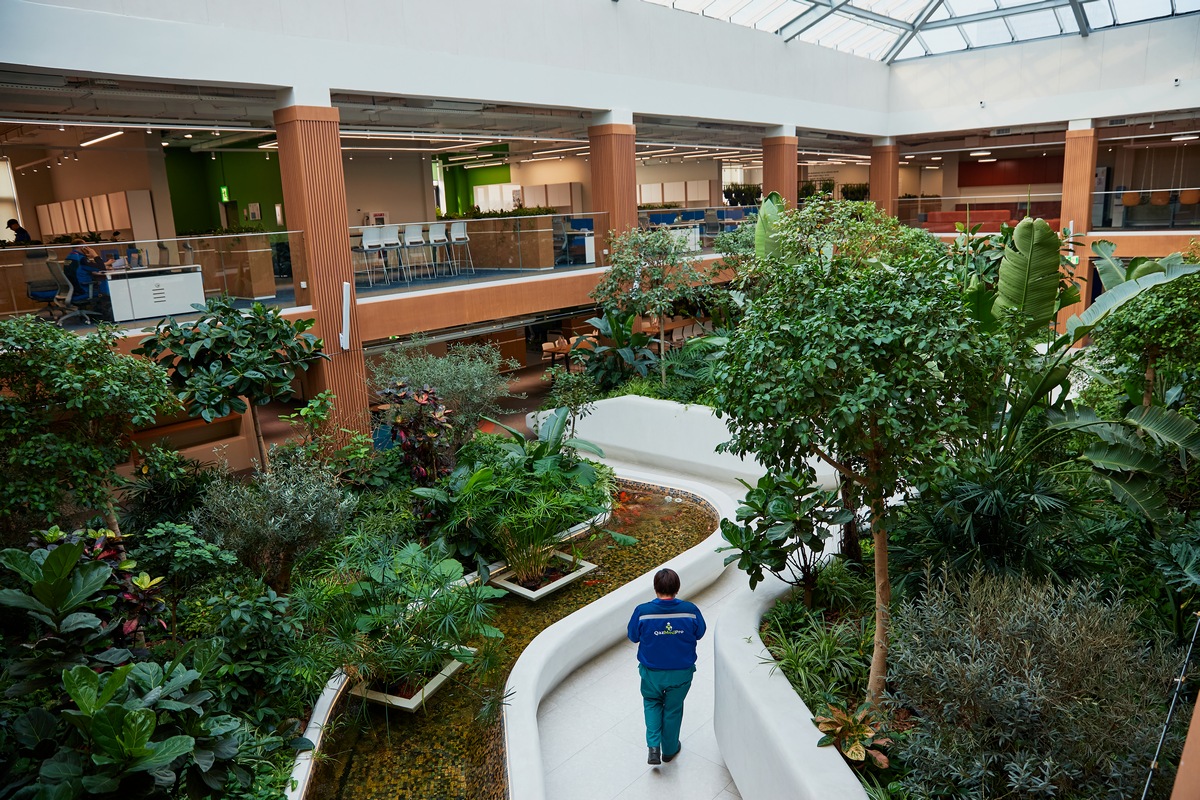 Переход из цеха в административный блок — и сразу контраст. Внутри пространство больше похоже на большой офис IT-компании. Под стеклянной крышей атриума разбит зимний сад. Пальмы, фикусы и густые заросли зелени. Между ними пруд с карпами. На двух этажах вокруг расположены офисы с панорамным остеклением и зоны отдыха с яркими креслами.