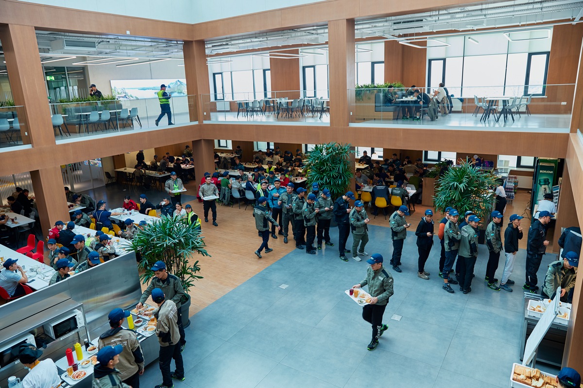Столовая занимает зал на тысячу мест. Обед бесплатный, входит в соцпакет. Меню плотное, рассчитанное на физический труд: супы, мясо и гарниры.