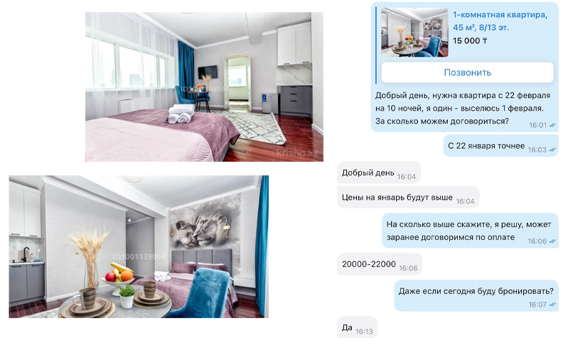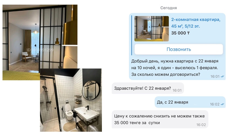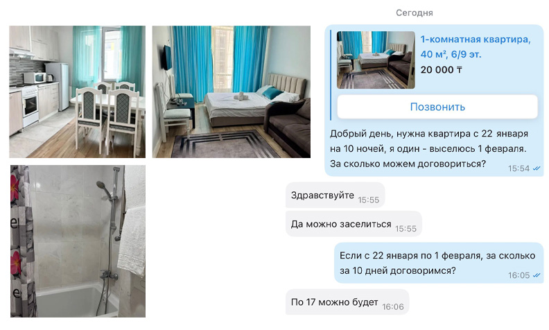 Мы связывались только с собственниками, исключив риелторов, чтобы получить максимально честную картину рынка. Результат оказался неоднозначным. Лишь один арендодатель согласился снизить цену: он уменьшил стоимость за 10 дней проживания с 20 до 17 тысяч тенге в сутки (и квартира, кстати, весьма хороша).
