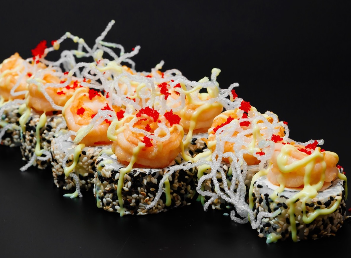 - «Снежная принцесса» – рис, нори, лосось, креветка темпура, зеленый лук, тобико, чеддер, унаги-соус и пармезан – 4 890 тенге;
