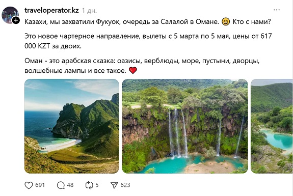 «Казахи, мы захватили Фукуок, очередь за Салалой в Омане. Кто с нами? Это новое чартерное направление. Вылеты с 5 марта по 5 мая. Цены – от 617 тысяч тенге за двоих. Оман – это арабская сказка: оазисы, верблюды, море, пустыни и дворцы».