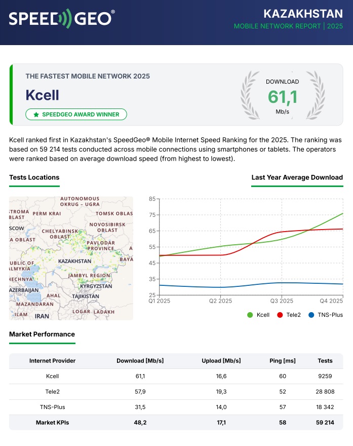 Согласно отчету компании за 2025 год, самый быстрый мобильный интернет в Казахстане показал оператор Kcell. Средняя скорость загрузки в сети компании составила 61,1 Мбит/с.
