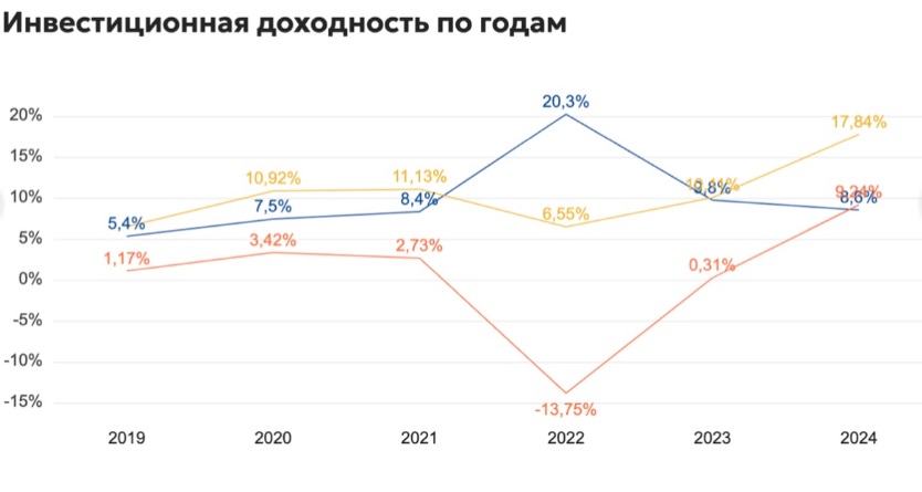 По ее словам, пенсионные деньги не лежат без движения – ими управляют и инвестируют. Доходность колебалась от 6,57% в 2019 году до 17,84% в 2024-м, а средний показатель за годы составил около 9,6%.
