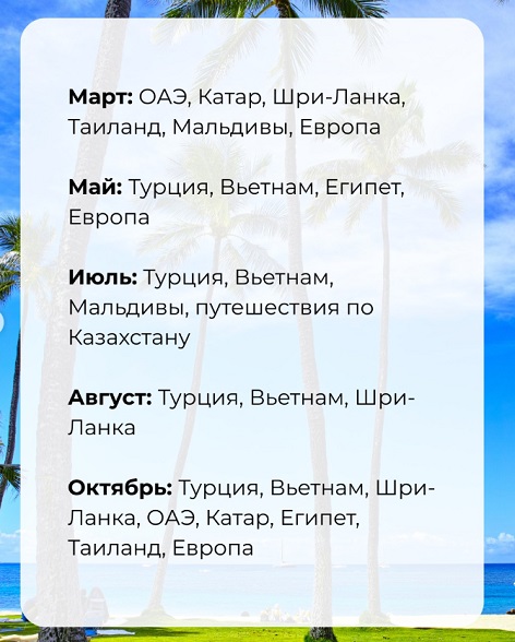 Самым привлекательным периодом он называет Наурыз: в конце марта казахстанцы смогут отдохнуть сразу пять дней подряд, что открывает возможности не только для пляжного отдыха, но и для европейских городов: