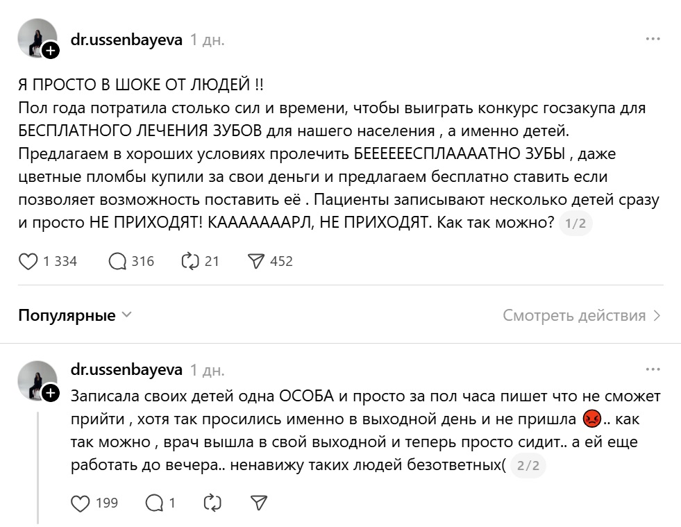 «Мы даже цветные пломбы купили за свои деньги и готовы ставить их бесплатно, если позволяет клиническая ситуация. Но люди не приходят. Я правда в шоке», – написала Усенбаева.