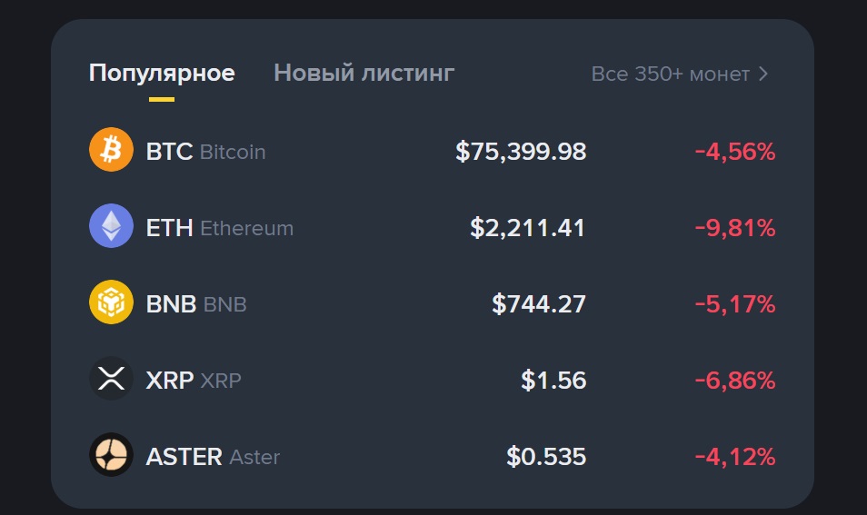 На утро 2 февраля, около 9:00, курс снизился до $75 399, после чего продолжил колебаться в этом диапазоне.