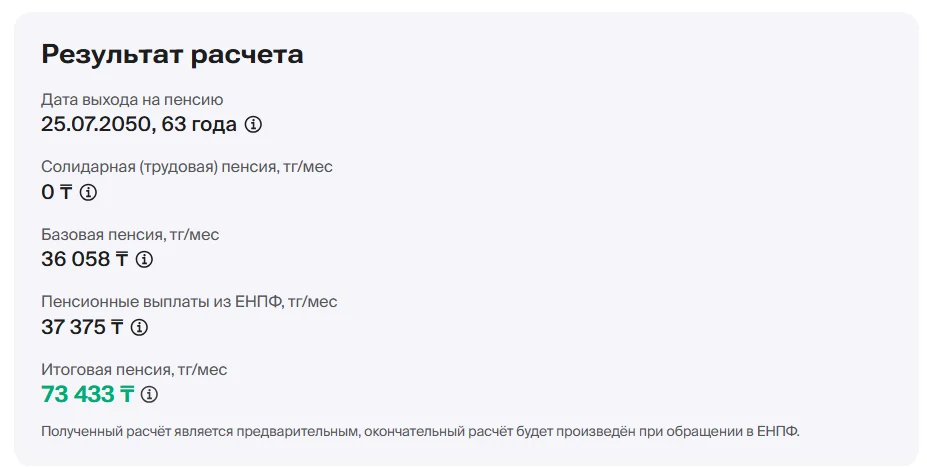 На ее пенсионном счете в ЕНПФ накопилось чуть менее 7 млн тенге с учетом инвестиционного дохода. Прогноз калькулятора показал, что к 2050 году ее ежемесячная пенсия составит всего 73 433 тенге.