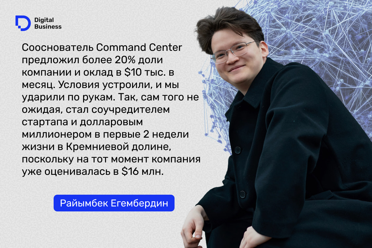 Сейчас парень живет в Сан-Франциско, где вместе с партнерами запустил стартап Command Center – он облегчает программистам взаимодействие с кодом. Совокупно проект уже привлек более $900 тыс. инвестиций при оценке в $40 млн. Специально для Digital Business Райымбек рассказал, почему еще в школьные годы начал работать в найме, как в 19 лет получил приглашение на должность заместителя коммерческого директора, а затем решил все бросить и уехать в США. Также поговорили о том, как стать фаундером успешного стартапа в Кремниевой долине, который уже заинтересовал OpenAI и Oracle.
